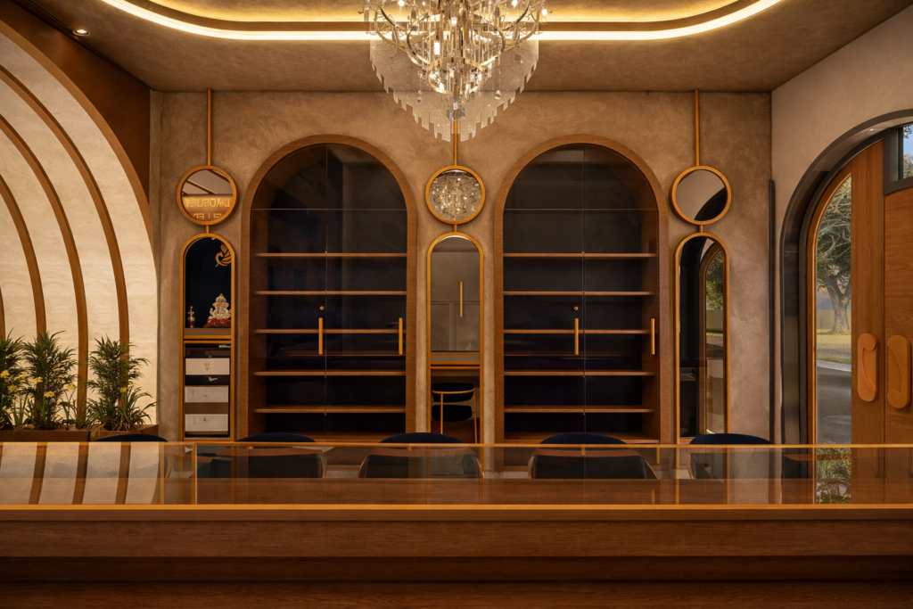 Arches became the primary architectural language, inspired by temple corridors and classical South Indian architecture. These arches guide movement, frame display units, and subtly slow down the customer’s journey — encouraging exploration and engagement.