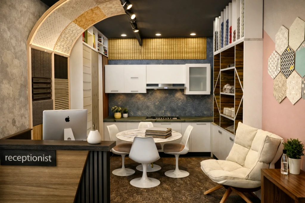 Commercial Interiors A curated set of commercial interior projects including Mr. Yasir’s curtains and wallpaper shop, Agasti Chettinadu Hotel, and Good in Office renders. Each project reflects functional planning, brand-focused design, and contemporary aesthetic solutions tailored to business needs.
