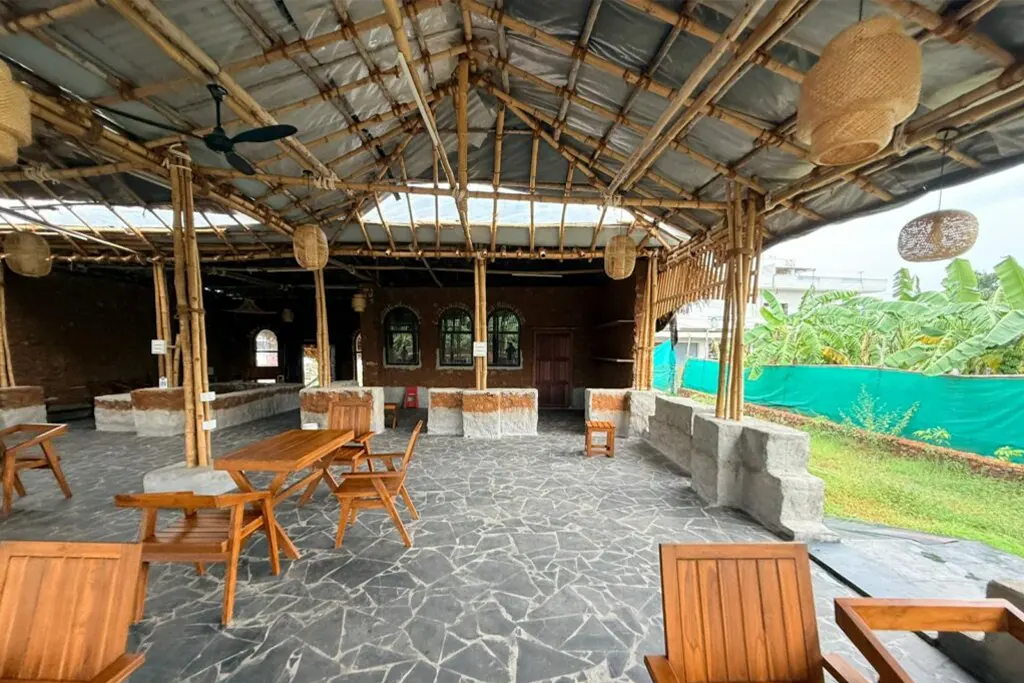 A rustic-themed restaurant project inspired by traditional architecture and natural materials. The design features exposed earth walls, bamboo structural elemen...